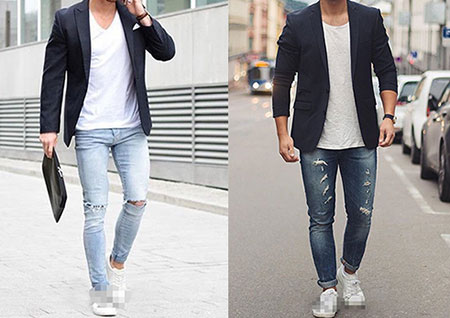 西裝外套搭配牛仔褲明顯休閑感更甚,不過(guò)西裝的款式需要注意,應(yīng)該以短款為主,因?yàn)榇钆渑W醒潱晕餮b顏色可以不需要那么講究,但萊特小編不建議內(nèi)搭襯衫,反而內(nèi)搭T恤更符合牛仔褲的隨性不羈。