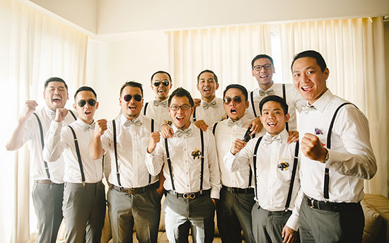 如果不是選擇在寒冷的冬天舉行婚禮,伴郎可以不需要將西裝都穿在身上,這時候可以把外套去掉,留下白色襯衫和領結即可。這樣的穿搭也是比較適合氣溫暖和的天氣,這樣也可以讓婚禮的主題偏輕松自然。伴郎的襯衫配上新郎簡潔大方的西裝,由于伴郎的服裝偏休閑,新郎的偏正式,這樣才能凸顯新郎的主角位置,同時也可以讓伴郎展示出他們兄弟間的獨特風采。
