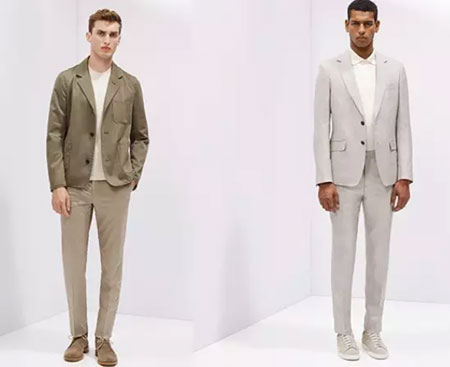 搭配方式:這兩季特別流行全身同色系的穿搭,春夏推薦淺卡其亞麻成套西裝,下身選擇九分貼身剪裁的西裝褲,搭上簡單白色帆布鞋,除了能營造純粹簡約、干凈俐落的形象之外,也能拉長身形比例,更顯高挑帥氣。