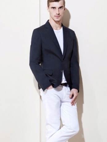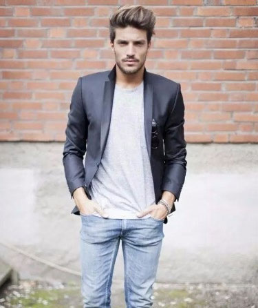 3、休閑西裝外套+淺色t恤+水洗牛仔褲。這是比較輕松休閑的搭配方式,內穿淺色t恤,搭配一條水洗牛仔褲,外套深色休閑西裝外套,適合春秋時節穿著。