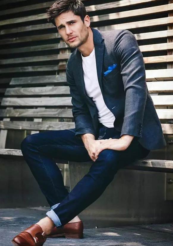 2、黑灰藍(lán)內(nèi)搭T恤+牛仔褲;黑灰藍(lán)西裝也是比較常見(jiàn)的套裝西裝,避免太正式,可以選擇單西內(nèi)搭T恤和深藍(lán)色牛仔褲,鞋子搭配可以選擇小白鞋或布洛克鞋,這效果也是不錯(cuò)的,年輕時(shí)尚的男士可以選擇這樣來(lái)搭配。