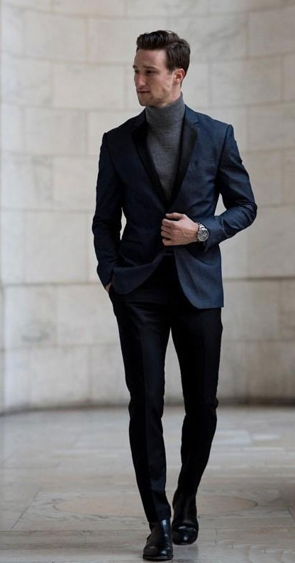 3、深藍(lán)色單西內(nèi)搭毛織衫+休閑黑色窄腳褲;可以多重提升并塑造出紳士的格調(diào),同時(shí)于沉穩(wěn)中見(jiàn)品味,不但展現(xiàn)自信,也顯儒雅的氣質(zhì)。