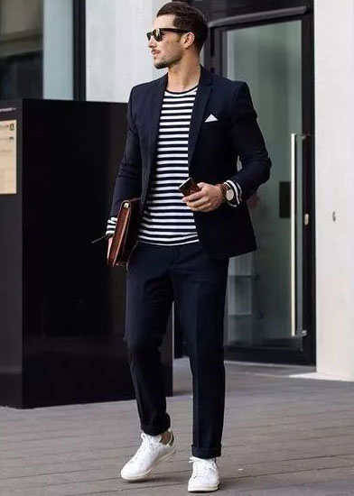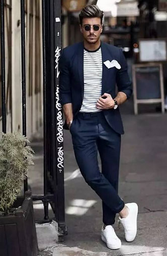 我們都知道西裝一般搭配的是皮鞋,這樣會(huì)顯得比較正式、紳士。而選擇小白鞋作為搭配,年輕感則比皮鞋要來得強(qiáng)烈一些。西裝搭配小白鞋同樣顯年輕時(shí)尚感,一再打破傳統(tǒng)的西裝搭配。