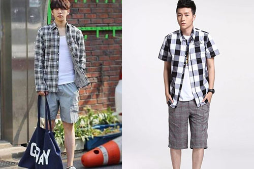 搭配一:格子襯衫+內(nèi)搭T恤+休閑短褲