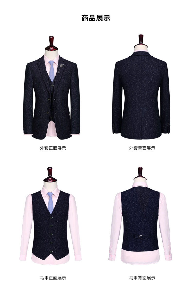 西服工藝說明圖片西服馬甲正反面款式圖西褲正反面款式圖西服駁頭細節圖西服內里細節圖西服下擺及腰頭細節圖西褲款式細節圖西褲款式細節圖