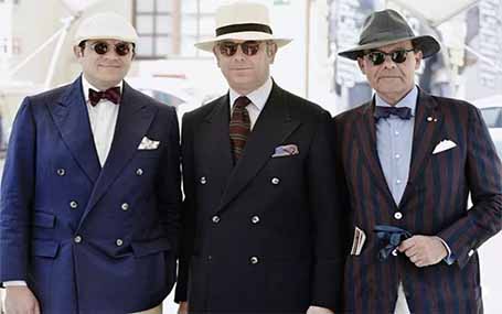 如果說西裝紐扣的位置,因改變西裝的造型而首先引起了人們的注意,那么,西裝紐扣的質感,便因其光澤和質地的不同,吸引并干擾人們對西裝屬性做出主觀判斷。隨著生產技術的提高,越來越多的材料被加工成紐扣,按其取材可簡單分為天然材料紐扣和人工合成紐扣。天然紐扣材料包括自然生成的牛角、貝殼、果殼、皮革、石材、竹木等;人工紐扣則包括:金、銀、銅、鐵、鋼等金屬材料;玻璃、瓷、混凝土、琺瑯、景泰藍、塑料、亞克力等提煉或合成材料。紐扣質感因材質而產生不同的紋理和光澤度,也會影響人們對西裝產生不同的主觀感受。其一,天然形成的有機紋理,多為不規則紋理,如牛角、貝殼、皮、石、木、果殼等,人造紋理如雕刻、印花、染色等。其二,光澤度則受不同材質紐扣的表面平整度影響,產生極光、啞光、自然光等不同光感。一般看來,晚間正式禮服,傾向使用黑寶石或與駁領絲緞相同的布面包扣這類光澤較高的材料,強調燈光照耀下熠熠生輝的典雅性;高檔商務正式西裝,更偏愛啞光且有機紋理的紐扣,天然或人造的牛角、貝殼質地、木、皮等紋理,強調西裝在自然光下,閃爍著更為自然不刺眼,質樸古拙余暉的文化性特點。金屬類紐扣更適合制服形制的西裝,如Blazer Suit,除了受文化習慣影響,金屬質地與象征軍人剛毅的性格更般配;皮質紐扣與獵裝風格的運動型西裝更搭,這也考慮了獵裝肩頭或袖肘上常有皮面補丁。其他石質、木質、玻璃、塑料等各類特殊質感,則需根據面料不同,在各類有設計感的西裝中搭配使用。